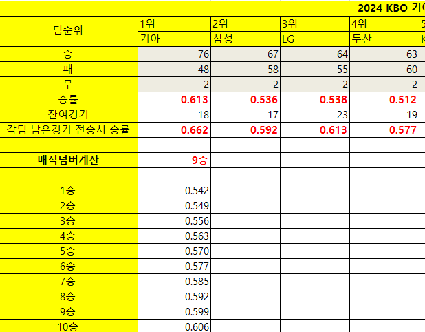 3. 2024 기아 매직넘버 잔여경기 우승확률